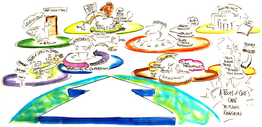 (In December 2002, about fifteen community leaders in Kingston came together to spend a day shaping a direction for the Kingston Closing the Distance Project. Homelessness was their focus. The following summarizes their discussion as captured in several wall-size graphic murals produced during the day.)
