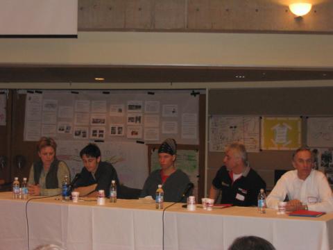 (Left to right) Former SPCKA Project staff Cathy Cleary and current staff Matt Silburn join ROOO tenant leaders Brad Heaslip and Lenny Landry and ROOO landlord leader Steve Manders in presenting to the Closing the Distance Provincial Conference in Toronto, March 23, 2004