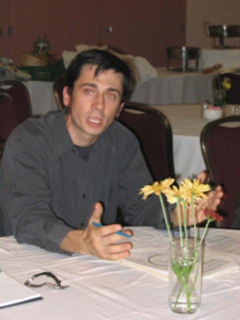 Brad Heaslip, ROOO leader, talks with Provincial Conference participant about the Kingston Closing the Distance Project