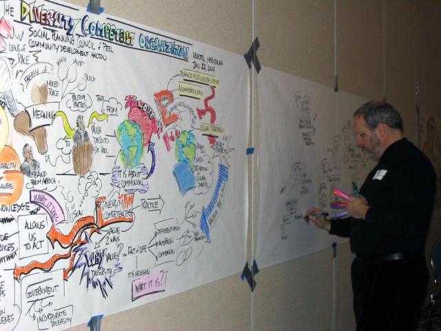 David Hasbury, SPNO Graphic Arts Facilitator, portrays Conference discussion on wall mural